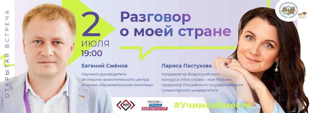2 июля в 19:00 говорим о нашей стране Завтра в прямом эфире Евгений Сжёнов, научный руководитель Экспертно-аналитического центра «Научно-образовательная политика» вместе с Ларисой Пастуховой, координатором Всероссийского конкурса «Моя страна – моя Россия», проректором Российского государственного гуманитарного университета, обсудят, как будет меняться Конкурс, а также «перезагрузку» образовательного...