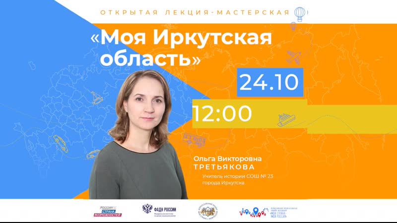 Сегодня, 24 октября в 12:00, нас встретит Иркутская область! Онлайн-занятие проведёт учитель истории СОШ № 23 города Иркутска Ольга Викторовна Третьякова. «Иркутский край уникален тем, что на его красивой Прибайкальской земле дружно проживают многие народности, которые хранят и чтут историю родного края о первопроходцах, путешественниках, декабристах, меценатах, государственном деятеле М. Сперанском,...