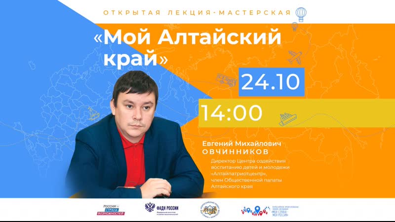 Сегодня, 24 октября в 14:00, нас встретит Алтайский край! Онлайн-занятие проведёт директор Центра содействия воспитанию детей и молодежи «Алтайпатриотцентр», член Общественной палаты Алтайского края Евгений Михайлович Овчинников. Эфир пройдёт в нашем сообществе ВКонтакте.