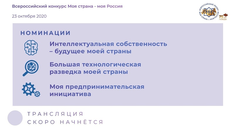 Сегодня в 14:00 в рамках Междисциплинарной проектной школы для финалистов XVII Всероссийского конкурса «Моя страна - моя Россия» в возрасте от 14 до 17 лет пройдут очные защиты в ещё двух номинациях: «Интеллектуальная собственность - будущее моей страны»; «Большая технологическая разведка моей страны»; «Моя предпринимательская инициатива» Желаем удачи конкурсантам и присоединяемся к просмотру защит...
