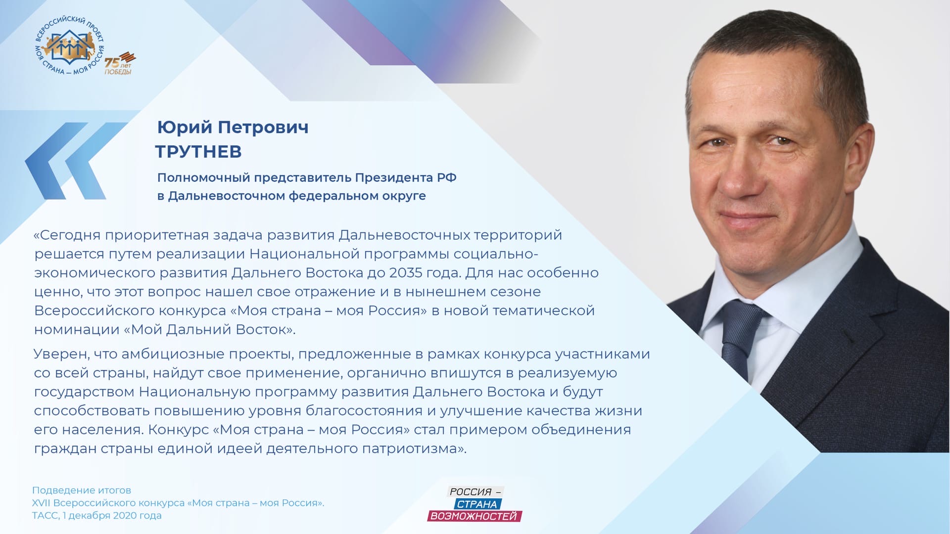 Полномочный представитель Президента Российской Федерации в Дальневосточном федеральном округе Юрий Петрович Трутнев. //Подведение итогов XVII Всероссийского конкурса «Моя страна - моя Россия». 1 декабря 2020 года//
