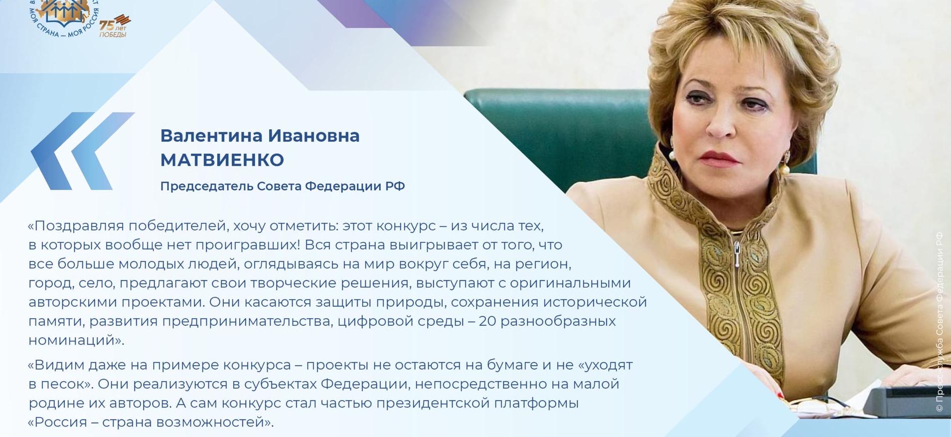 Председатель Совета Федерации Федерального Собрания Российской Федерации Валентина Ивановна Матвиенко. //Подведение итогов XVII Всероссийского конкурса «Моя страна - моя Россия». 1 декабря 2020 года//