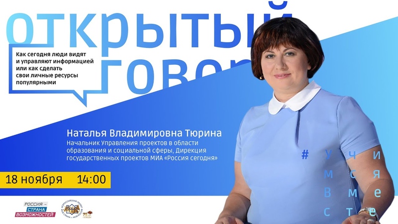 Как сегодня люди видят и управляют информацией? Как сделать свои личные ресурсы популярными? 18 ноября в 14:00 узнаем ответы на актуальные вопросы во время #ОткрытогоРазговора с начальником Управления проектов в области образования и социальной сферы Дирекции государственных проектов МИА «Россия сегодня» Натальей Тюриной.