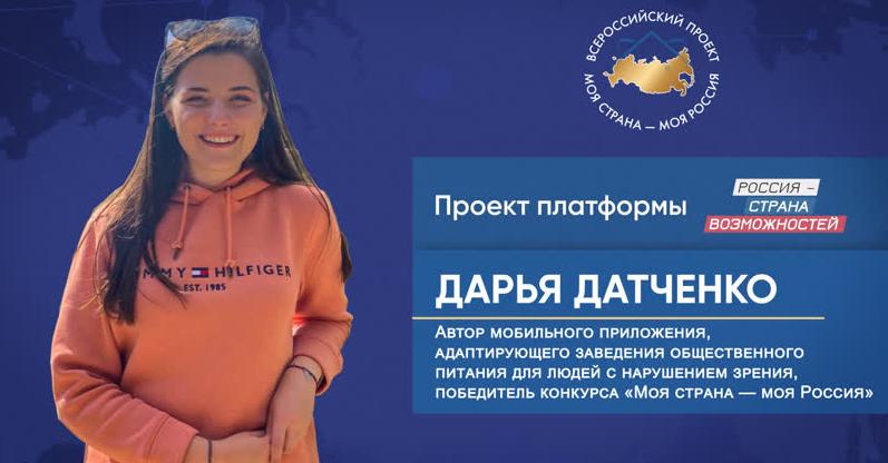 История успеха создателя мобильного приложения для незрячих⭐ Новая героиня конкурса «Моя страна — моя Россия» живёт и работает в Ростове. Дарья Датченко создала мобильное приложение для людей с проблемами зрения «Доступная еда». Разработка Дарьи содержит аудиоверсии меню ресторанов, которые незрячие люди могут прослушать как на своих смартфонах, так и на гаджетах персонала адаптированного заведения....