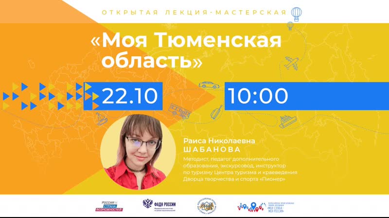 Сегодня, 22 октября в 10:00, отправляемся в Тюменскую область! Онлайн-занятие проведёт методист, педагог дополнительного образования, экскурсовод, инструктор по туризму Центра туризма и краеведения Дворца творчества и спорта «Пионер» Раиса Николаевна Шабанова.