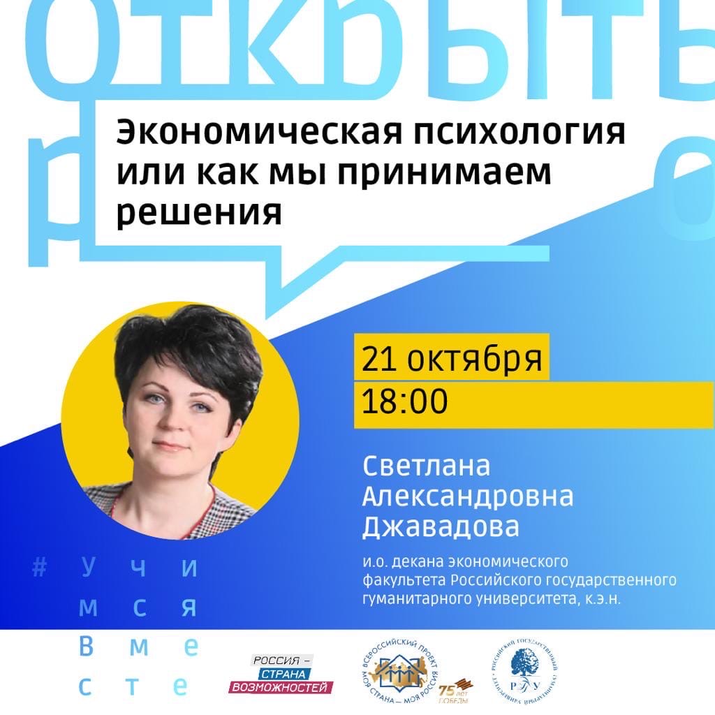 Прямо сейчас в рамках образовательного онлайн-проекта #УчимсяВместе #ОткрытыйРазговор с и.о. декана экономического факультета Российского государственного гуманитарного университета, кандидатом экономических наук Светланой Александровной Джавадовой. Тема встречи: «Экономическая психология или как мы принимаем решения»