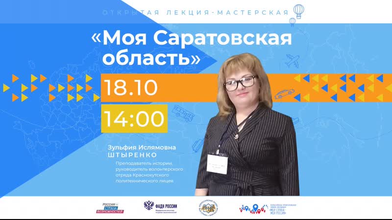 Сегодня, 18 октября в 14:00, отправляемся в Саратовскую область! Онлайн-занятие проведёт преподаватель истории, руководитель волонтерского отряда Краснокутского политехнического лицея, эксперт Всероссийского конкурса «Моя страна – моя Россия» Зульфия Ислямовна Штыренко. «Характерной особенностью Саратовской области является то, что это единственный регион во всей России, который объединил в себе...