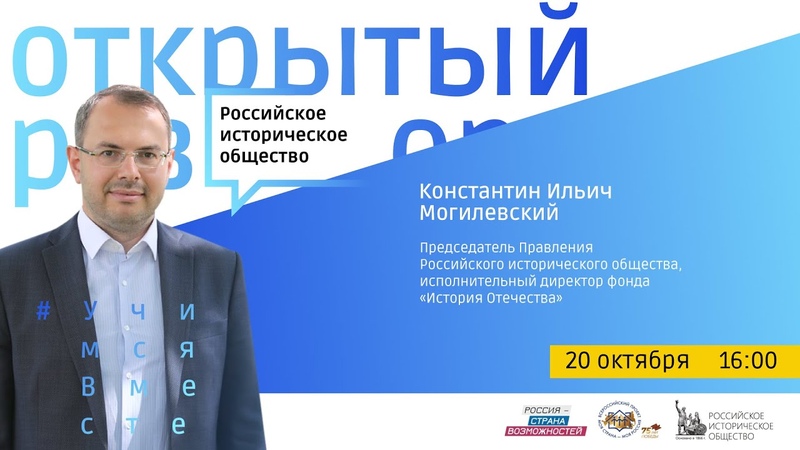 Сегодня в 16:00 #ОткрытыйРазговор в рамках образовательного проекта #УчимсяВместе с Председателем Правления Российского исторического общества, исполнительным директором фонда «История Отечества» Константином Ильичом Могилевским. Говорим о популяризации российской истории в Российской Федерации и за рубежом, сохранении исторического наследия и традиций народов России, а также поддержке программ исторического...