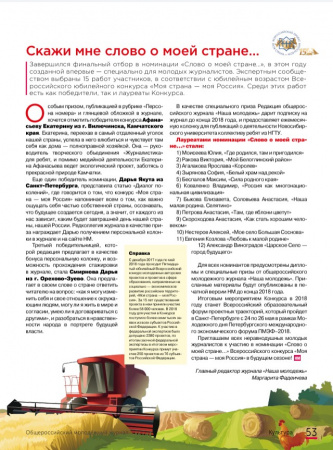 Завершился финальный отбор в номинации «Слово о моей стране…», в этом году созданной впервые — специально для молодых журналистов. Экспертным сообществом выбраны 15 работ участников, в соответствии с юбилейным возрастом Всероссийского юбилейного конкурса «Моя страна — моя Россия». Среди этих работ есть как победители, так и лауреаты Конкурса. Особым призом, публикацией в рубрике «Персона номера» ...