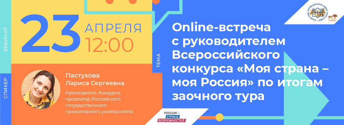 Мы запускаем серию дистанционных образовательных мероприятий для участников XVII Всероссийского конкурса «Моя страна - моя Россия». 23 апреля в 12:00 откроет образовательную программу руководитель Конкурса, проректор Российского государственного гуманитарного университета Лариса Пастухова. Ссылка на вебинар: https://events.webinar.ru/17906399/4385004 В рамках образовательных мероприятий...