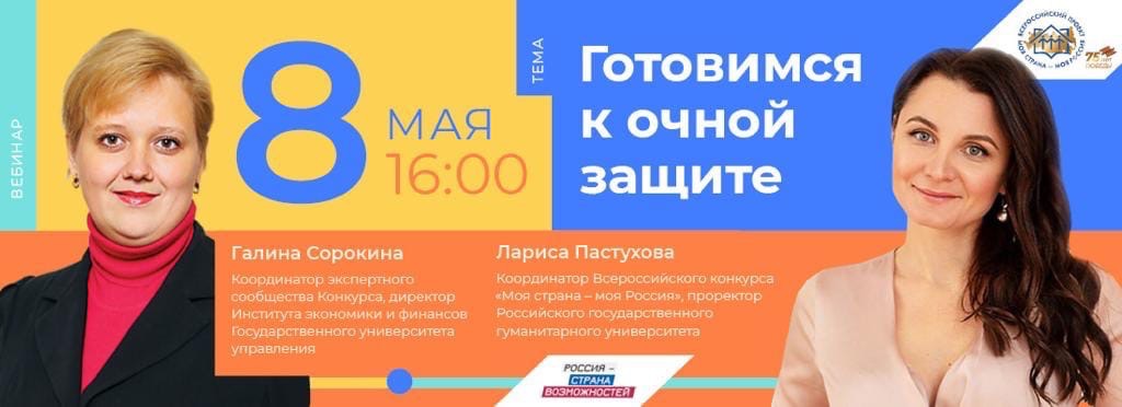 Мы знаем, что вы особенно ждали эту встречу! 8 мая в 16:00 Галина Сорокина, координатор экспертного сообщества Конкурса, директор Института экономики и финансов Государственного университета управления, и Лариса Пастухова, координатор Конкурса, проректор Российского государственного гуманитарного университета, проведут вебинар для участников очного тура XVII Всероссийского конкурса «Моя страна - ...