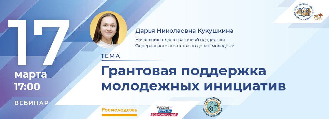 17 марта в 17:00 приглашаем принять участие в вебинаре начальника отдела грантовой поддержки Федерального агентства по делам молодежи Дарьи Кукушкиной на тему: «Грантовая поддержка молодежных инициатив». Трансляция вебинара: https://youtu.be/k5rKB6Or-Wc Дарья Кукушкина расскажет о секретах составления грантовой заявки для участия во Всероссийском конкурсе молодежных проектов среди физических лиц...