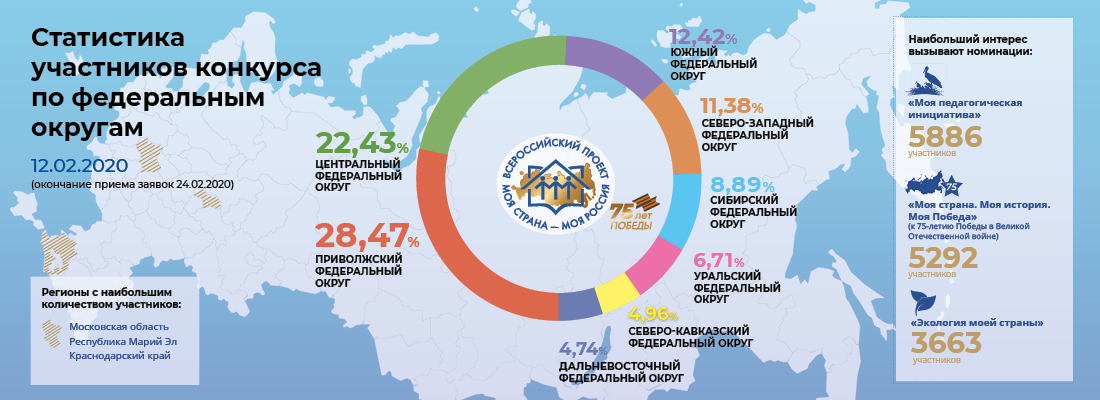 24 февраля завершилась заявочная кампания XVII всероссийского конкурса «Моя страна – моя Россия» – одного из проектов президентской платформы «Россия – страна возможностей». Число участников превысило отметку в 60 тысяч человек. Прием заявок проходил со 2 декабря 2019 года по 24 февраля 2020 года. Лидерами по числу регистраций стали Краснодарский край (6,3%), Московская область (5,4%), Санкт-Петербург...