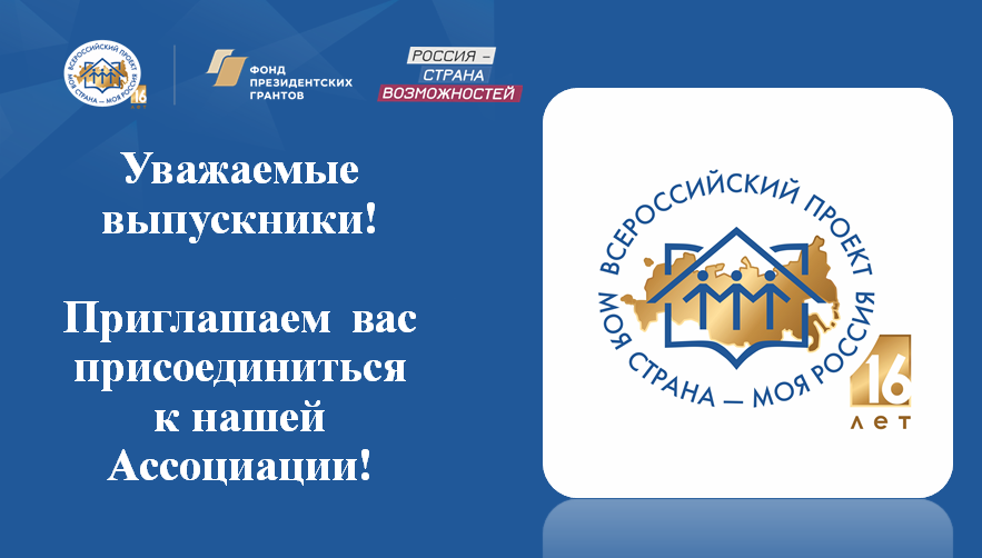 Число членов Ассоциации выпускников конкурса «Моя страна - моя Россия» растет с каждым днем. Если ты готов поделиться опытом участия в конкурсе, рассказать о своём проекте, о роли конкурса в твоей жизни, а также принять участие в новых образовательных и кадровых проектах – присоединяйся к нашей Ассоциации! Для этого необходимо пройти регистрацию на сайте проекта «Моя Страна –моя Россия», заполнить...
