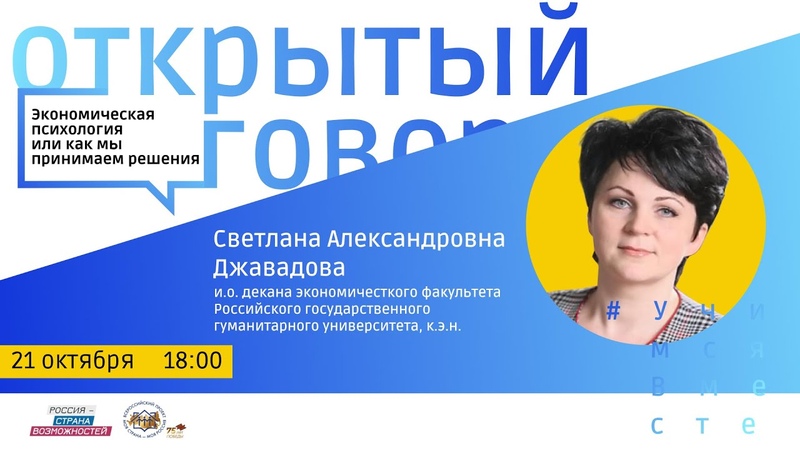 Прямо сейчас в рамках образовательного онлайн-проекта #УчимсяВместе #ОткрытыйРазговор с и.о. декана экономического факультета Российского государственного гуманитарного университета, кандидатом экономических наук Светланой Александровной Джавадовой. Тема встречи: «Экономическая психология или как мы принимаем решения»