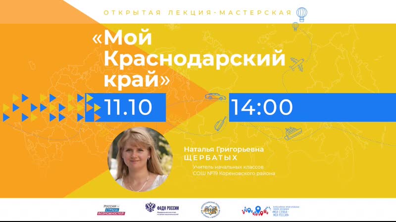 Сегодня, 11 октября в 14:00, нас встретит Краснодарский край! Онлайн-занятие проведёт учитель начальных классов СОШ №19 Кореновского района Наталья Григорьевна Щербатых. «Краснодарский край – особенный регион: за один день здесь можно побывать в разных климатических условиях, полюбоваться яркими высокогорными цветами, поиграть в снежки, промчаться на лыжах и искупаться в Чёрном море. Я решила принять...