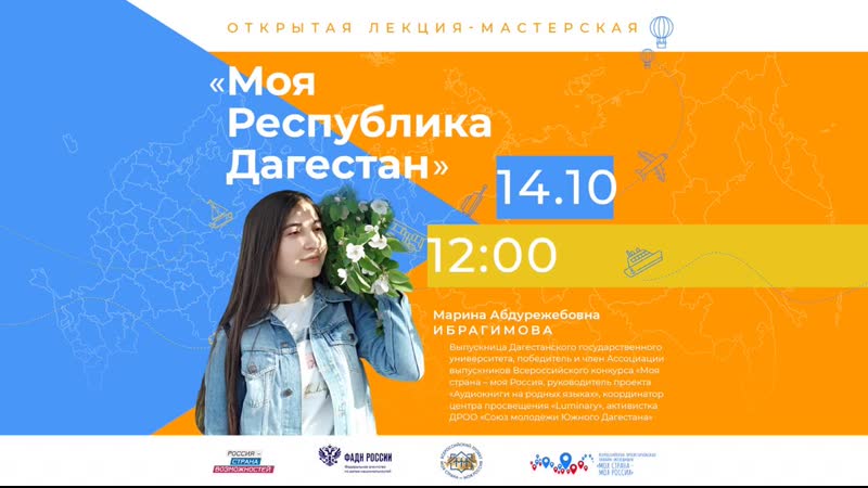 Сегодня, 14 октября в 12:00, отправляемся в Республику Дагестан! Онлайн-занятие проведёт выпускница Дагестанского государственного университета, победитель и член Ассоциации выпускников Всероссийского конкурса «Моя страна - моя Россия», руководитель проекта «Аудиокниги на родных языках», координатор центра просвещения «Luminary», активистка ДРОО «Союз молодёжи Южного Дагестана» Марина Ибрагимова....