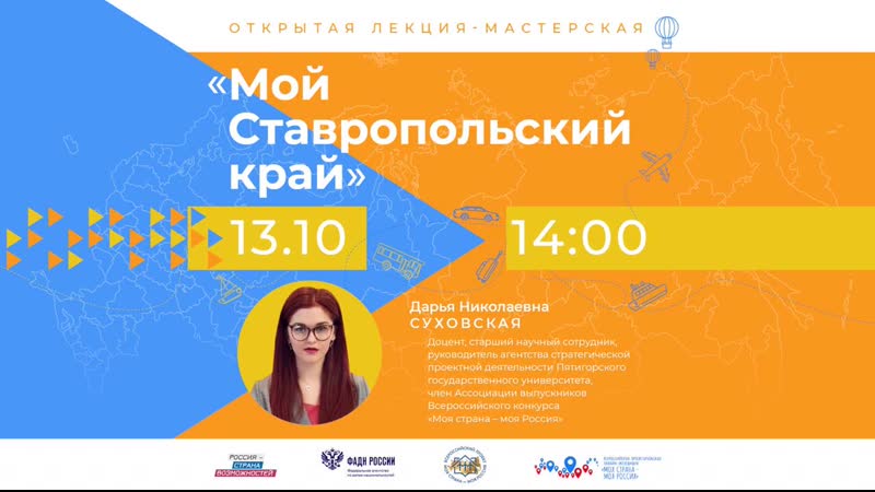 Сегодня, 13 октября в 14:00, отправляемся в Ставропольский край! Онлайн-занятие проведёт доцент, старший научный сотрудник, руководитель агентства стратегической проектной деятельности Пятигорского государственного университета, член Ассоциации выпускников Всероссийского конкурса «Моя страна – моя Россия» Дарья Николаевна Суховская. «Я представляю город Пятигорск – сердце Северо-Кавказского федерального...
