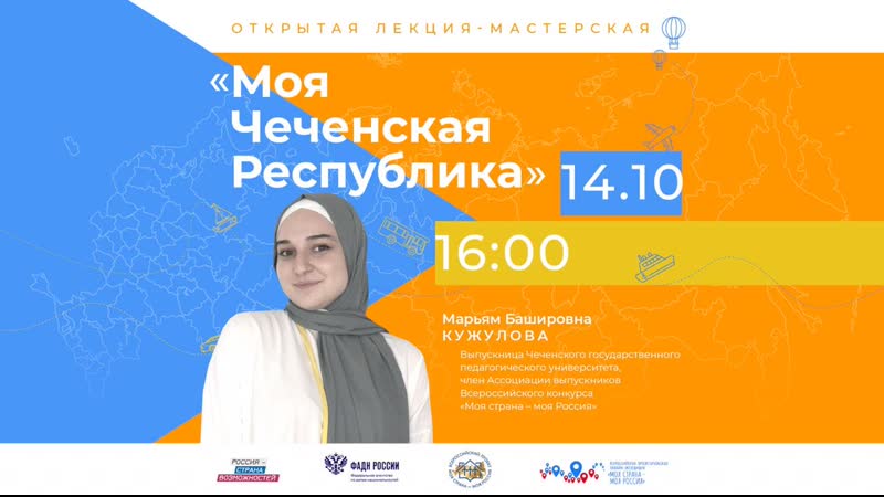 Сегодня, 14 октября в 16:00, отправляемся в Чеченскую Республику! Онлайн-занятие проведёт выпускница Чеченского государственного педагогического университета, член Ассоциации выпускников Всероссийского конкурса «Моя страна – моя Россия» Марьям Кужулова. Эфир пройдёт в нашем сообществе ВКонтакте.